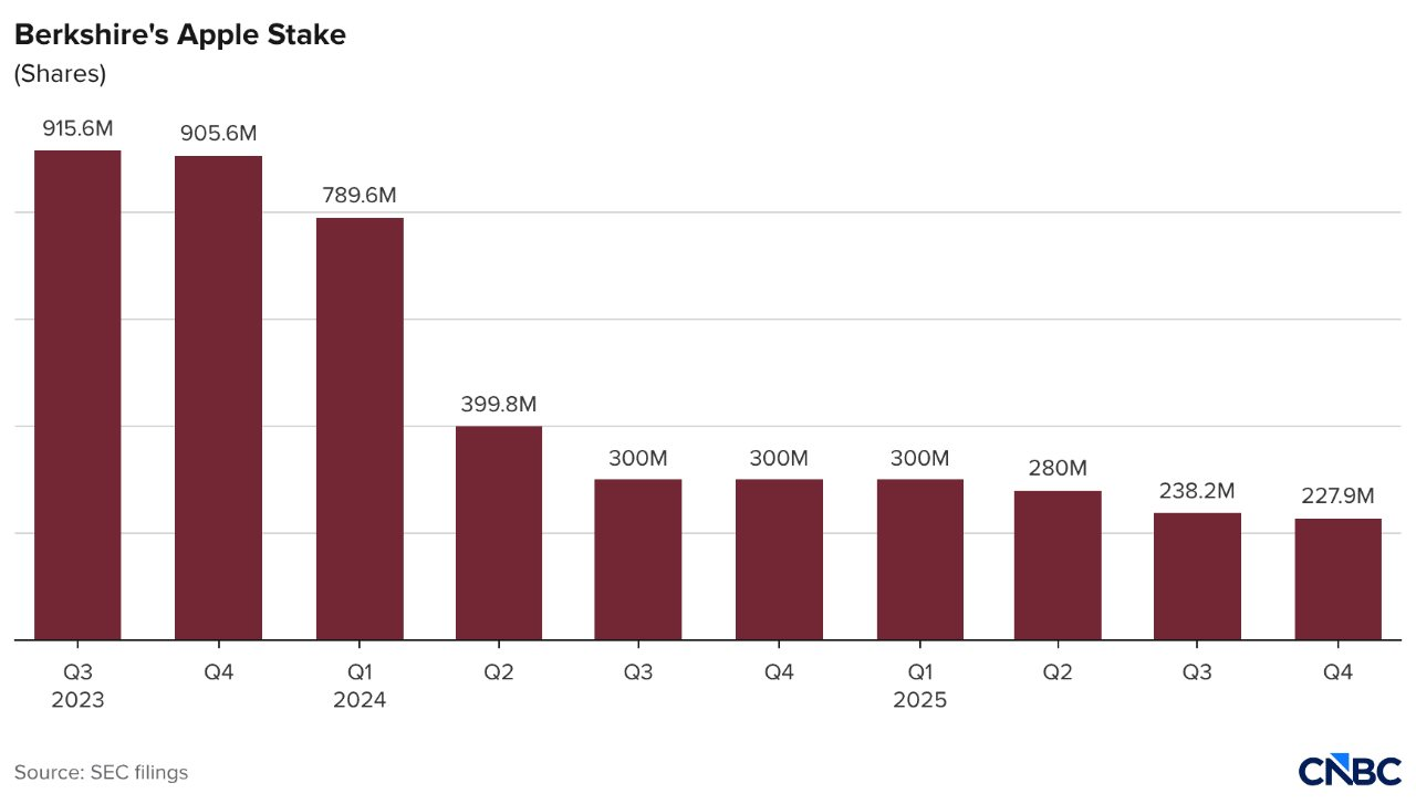 Suốt nhiều năm qua, Apple luôn được coi là "viên ngọc quý" trên vương miện của Berkshire Hathaway. Tuy nhiên, số liệu mới nhất cho thấy một sự thay đổi tư duy rõ rệt. Trong quý IV/2025 vừa qua, tập đoàn này đã tiếp tục bán ra cổ phiếu Apple, đánh dấu quý thứ ba liên tiếp và là lần thứ 7 trong số 9 quý gần nhất họ thực hiện việc giảm tỷ trọng này.